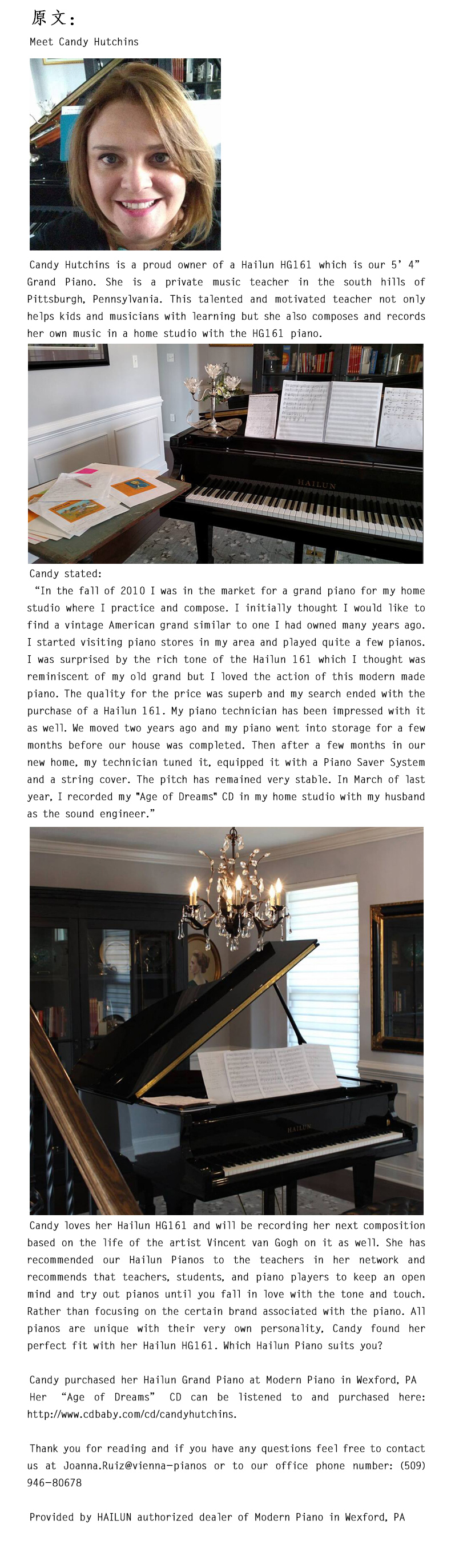 Candy說:“2010年秋天我去琴行打算為自己平時(shí)創(chuàng)作的工作室挑選一款三角鋼琴。剛開始我以為,我會選購一架和我?guī)啄昵百I的那架比較相似的古典美國三角鋼琴。在我家附近的琴行轉(zhuǎn)了好多家,并且試彈了好幾架鋼琴。我被一款海倫161鋼琴的音色所驚艷到了,它讓我想起了我之前的那架老式三角鋼琴,但是我更喜歡這款現(xiàn)代工藝制造的鋼琴。不管是質(zhì)量還是價(jià)位都非常好,所以我就選定并購買了這架海倫161鋼琴。我的鋼琴技師也很喜歡這架鋼琴。兩年前我們搬家的時(shí)候,由于要裝修新家而不得已把它存放在保管所好些個月。新家裝修完后,我的技師把它搬回了家,調(diào)了下音,并且給他配了一個鋼琴保護(hù)系統(tǒng)和琴罩。它的音準(zhǔn)還是那么的穩(wěn)定。去年三月,我和我作為音響師的丈夫在自家工作室共同創(chuàng)作了"Age of Dreams" 這張CD。”