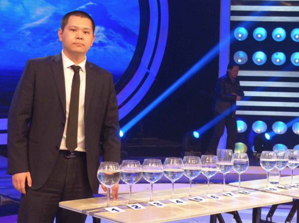 工作人員小心翼翼地把調好音的三十個高腳杯抬上了舞臺,準確的音高在現(xiàn)場獲得了滿堂喝彩,劉浩的聽音能力真是了得,他背對這些高腳杯,一次能夠分辨出同時發(fā)出的六個音!演出大獲成功!這個節(jié)目也在演出中獲得了令人欣喜的成績!