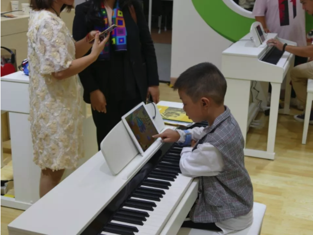在海倫智能鋼琴教室展位上,有很多慕名前來的琴童家長朋友,他們對海倫鋼琴推出的這種新型教育理念很感興趣,并表示有意讓自家孩子嘗試這種“智能學琴”方式。