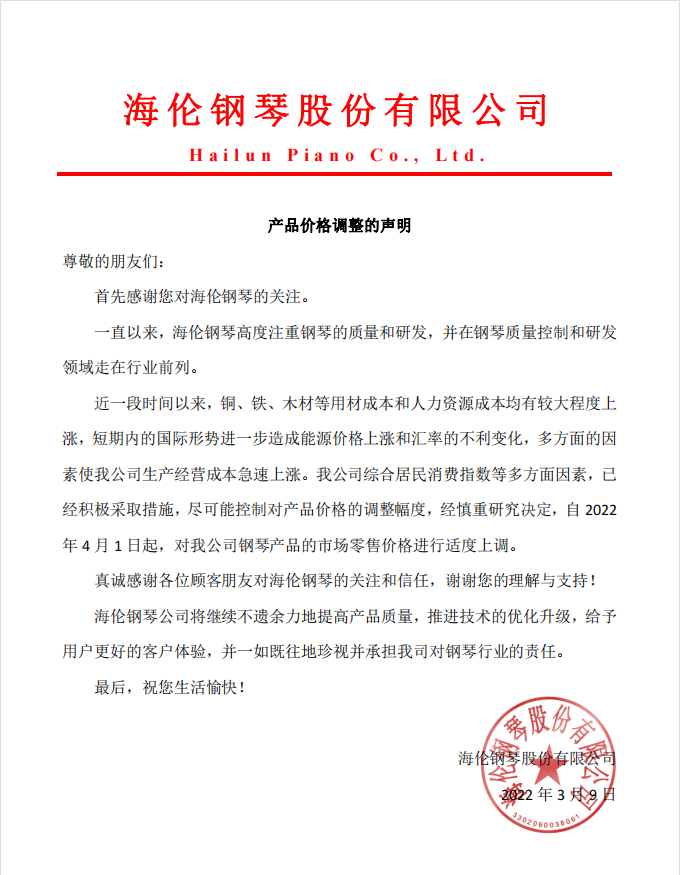 近一段時間以來,銅、鐵、木材等用材成本和人力資源成本均有較大程度上漲,多方面的因素使我公司生產經營成本存在很大的上漲壓力。我公司已經積極采取措施,盡可能控制對產品價格的上調幅度。綜合居民消費指數等多方面因素,經我公司慎重研究決定,自2021年4月1日起,對我公司自有的“海倫”、“文德隆”、獲授權制造的“羅瑟”品牌鋼琴產品的市場零售價格進行適度上調。