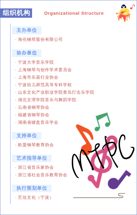 2022(第五屆)MTPC 音才獎寧波鋼琴藝術節,在世界鋼琴行業異軍突起影響卓著的中國鋼琴品牌—海倫鋼琴的支持下,迎來了它蓬勃發展的第 5 年。每屆藝術節都歷時長達半年以上,幾十個藝術節運營中心、百個城市合作機構加持合作,覆蓋全國二十多個省份,同時在線下和網絡平臺搭載數十場音才講座、大師特訓班、音樂會等系列活動,一步步將藝術節活動規模推向新的頂峰。自 2018 年創始,秉著更專業更活力更開放的準則,一步一個腳印踏實向前步進,至目前,直接參與人數已超十萬,累計觀眾超百萬。藝術節期間,歷年來邀請鮑蕙蕎、李民、謝哲邦、米蘭·弗朗尼克、彼得·保羅·凱拉夫、格雷厄姆·斯科特等擔任藝術節主席或藝術顧問,強大的鋼琴藝術領域聯合陣容,加上幾十位國內外音樂名家、教育家齊聚,傾力助陣參與音樂嘉年華,成就一場極具規模、層次、影響力的權威藝術盛典。