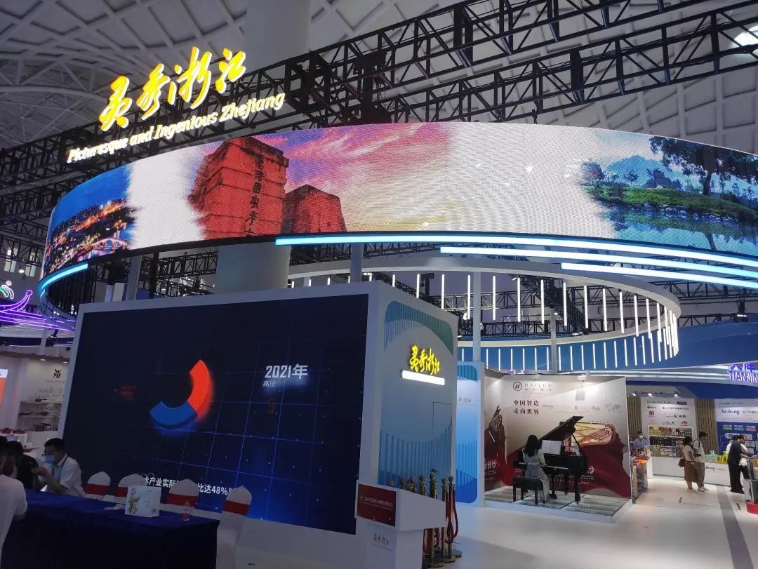 在浙江主題館有海倫鋼琴、蘇泊爾等18家浙江品牌企業參展,多角度展示浙江經濟社會發展總體情況以及雙循環發展格局下浙江的新成效。